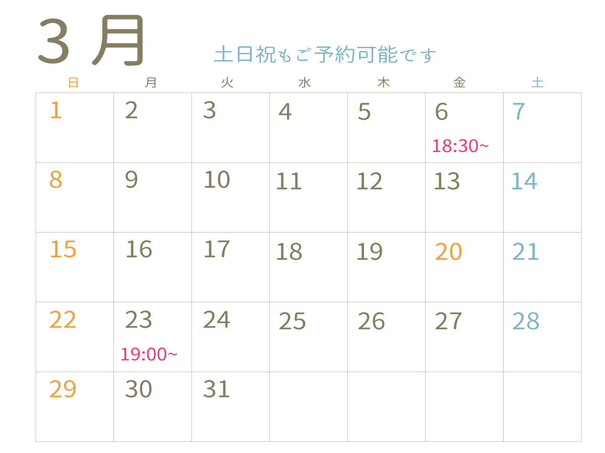 3月6日(金)18時30分~、23日(月)19時~ご予約可能です今のところお休みは無しで営業しております♪